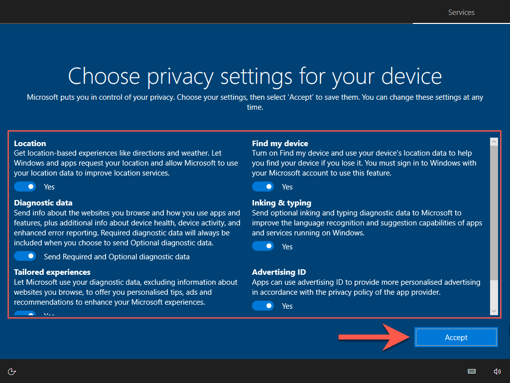 6. Review your privacy settings—e.g., Location, Diagnostic data, and Advertising ID. Disable anything if needed and select Accept.