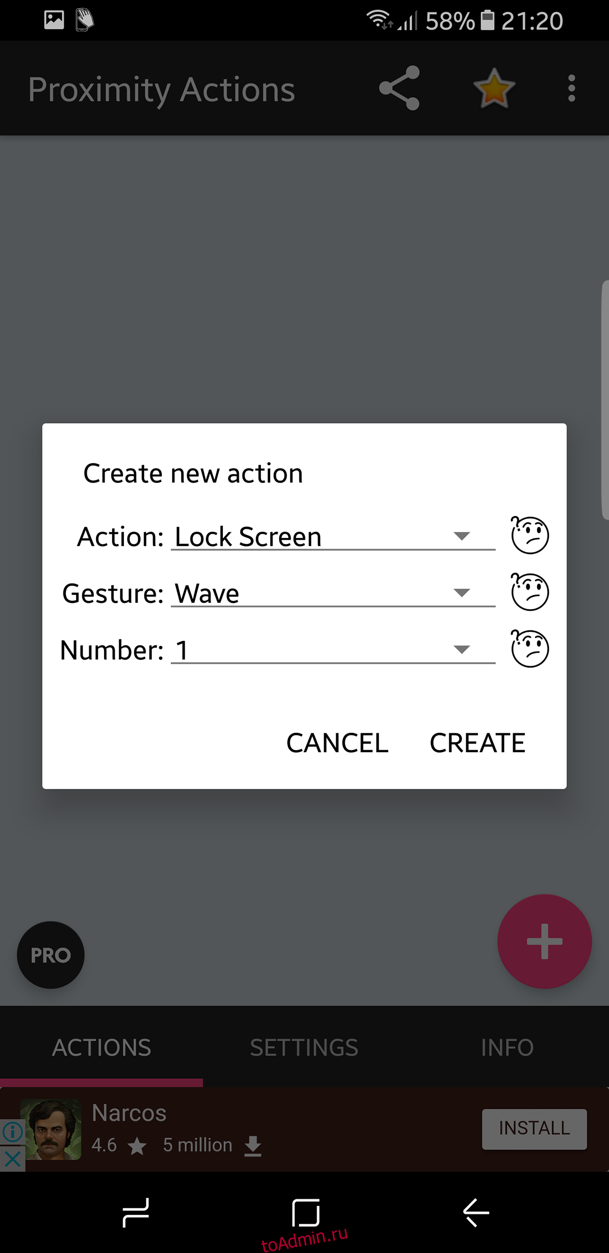 Proximity Actions берет концепцию, представленную в Gravity Screen, и добавляет к ней уровень настройки. Теперь вы можете назначить, какие действия будут выполняться в зависимости от датчика приближения. Таким образом, ваш телефон может выполнять следующие действия в зависимости от того, какой жест вы ему назначили.
