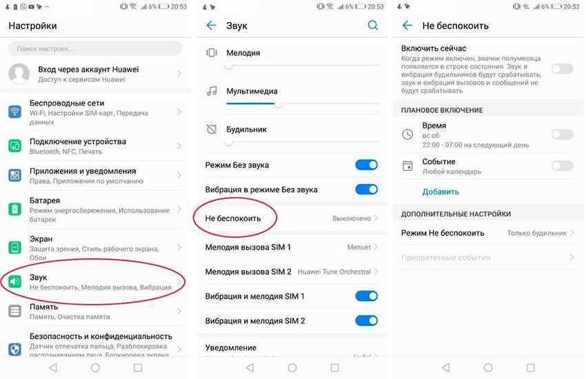 Перечень выполняемых действий совсем немного отличается от алгоритмов, характерных для смартфонов других брендов. Для доступа к опции нужно перейти по пути «Настройки – Звук – Не беспокоить», а затем определиться, включить режим сейчас или настроить его плановое включение в соответствии с заданным расписанием. Перечень доступных настроек на смартфонах Huawei чуть не такой, как на телефонах ранее упомянутых брендов. Пользователи могут выбрать один из трех вариантов: