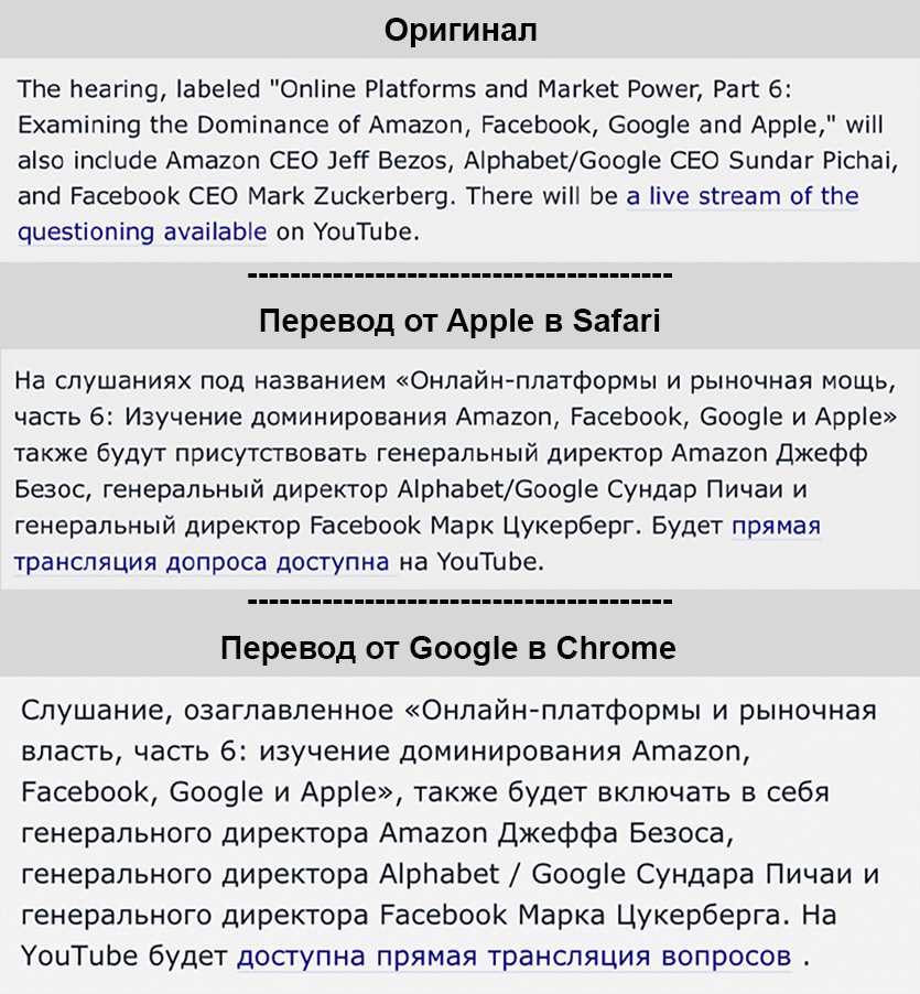 Для сравнения, вот как Safari с переводчиком от Apple и Chrome с переводчиком от Google справились с одним и тем же текстом: