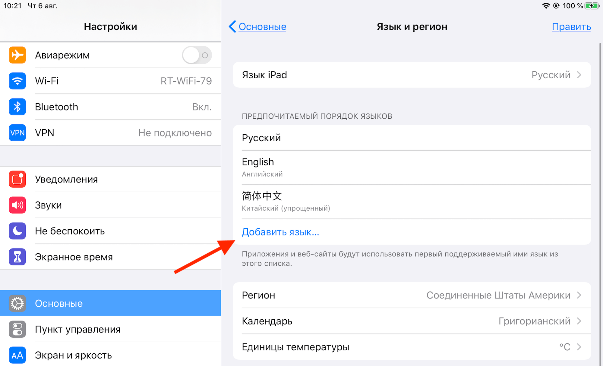 - Перейдите в меню Настройки → Основные → Язык и регион.