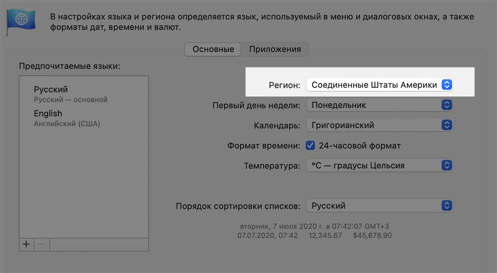 1. Нужно зайти в настройки своего Mac 2. Выбрать пункт «Язык и регион» 3. Поменять регион с «России» на «Соединённые Штаты Америки»