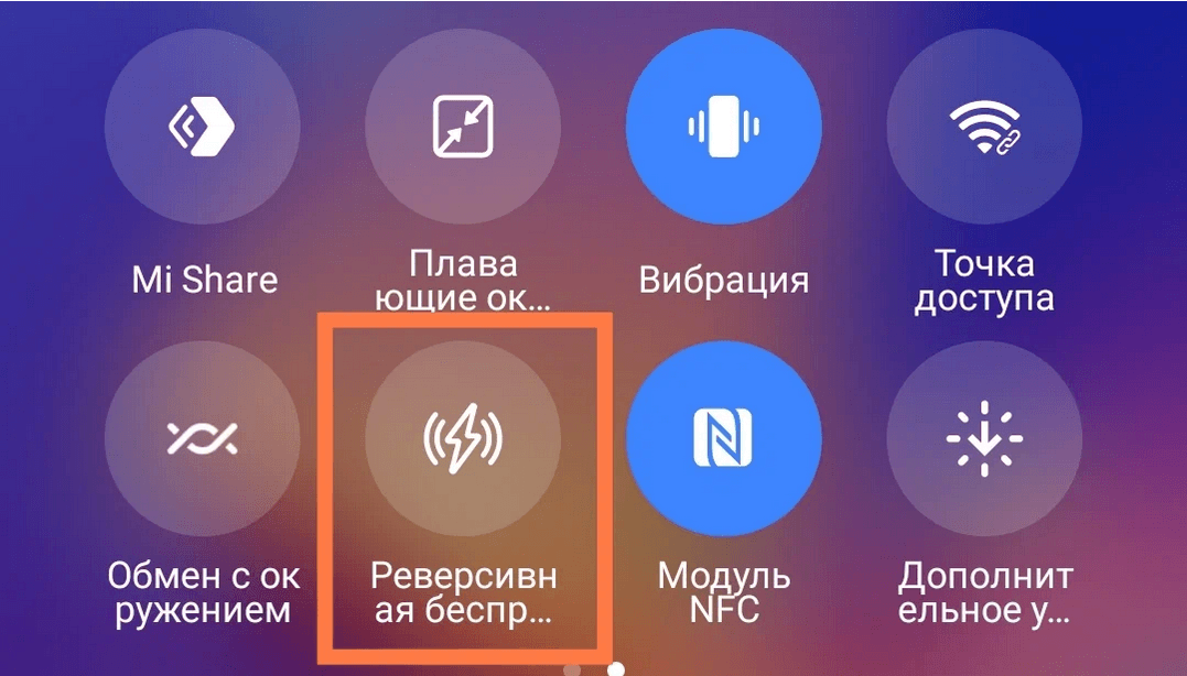 - Вызовите шторку с иконками быстрого доступа. Одна из них так и называется «Реверсивная беспроводная зарядка». Нажмите её и функция будет активирована.
