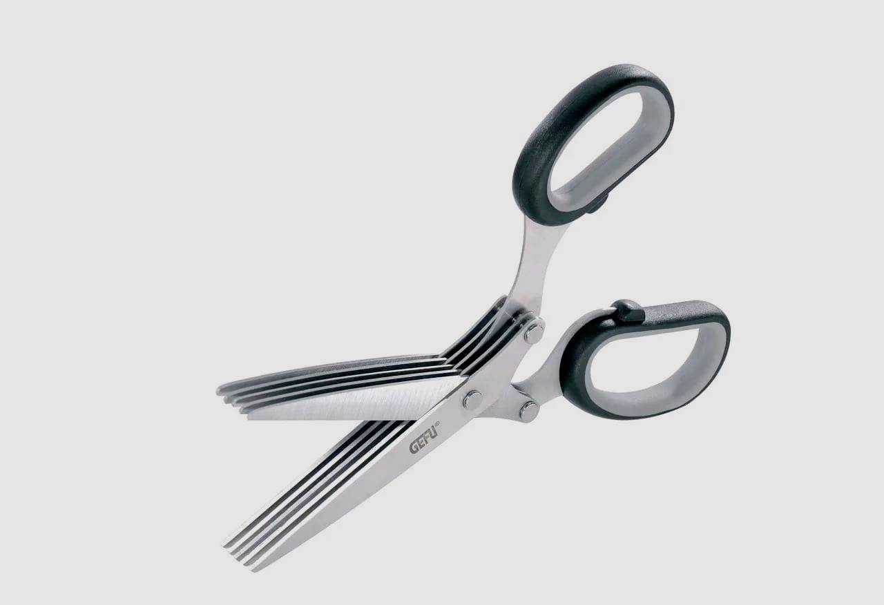 В кухонных ножницах с тремя или пятью лезвиями все режущие полотна закреплены ежиным сложным винтовым механизмом параллельно друг другу. В итоге одним движением хозяйка делает сразу три или пять режущих действий. Отзывы об инструментах такого типа противоречивы. Одним нравится скорость работы, а другие утверждают, что нарезка сложна и неудобна.