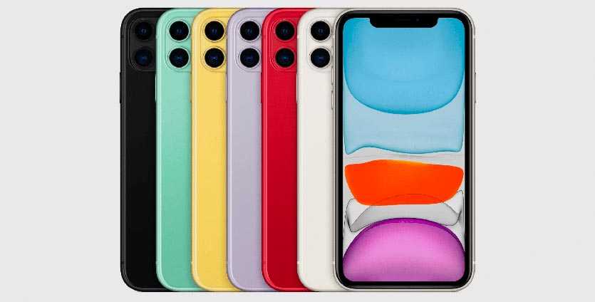 iPhone 11: габариты смартфона 150,9 х 75,7 х 8,3 мм, весит модель 194 грамма. Гаджет продается в шести расцветках: чёрной, белой, желтой, зеленой, красной и фиолетовой.