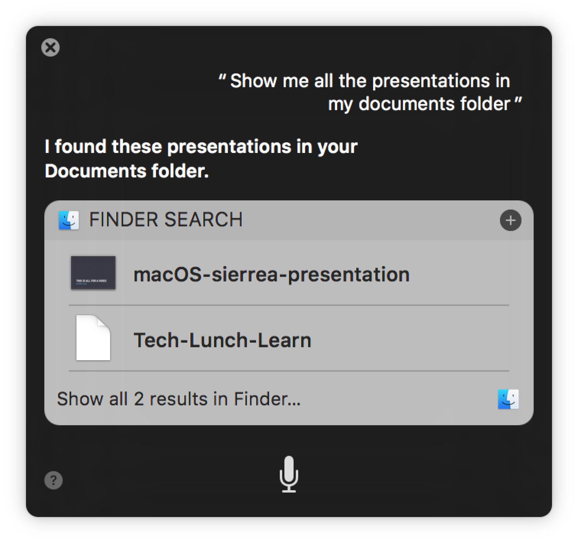 But my favorite part of Siri is how it integrates into the file system. I can tell Siri, “Show me all the presentations in my Documents folder” and that list will come up. You can also request to look at files shared by someone else.