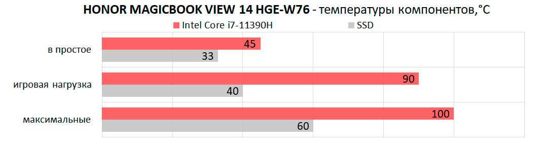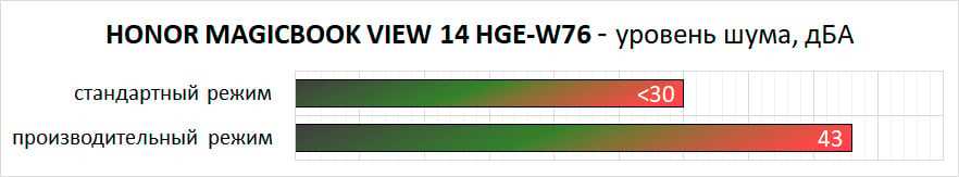 Honor MagicBook View 14 HGE-W76 вполне можно назвать почти бесшумным при повседневных задачах – в комнате его не слышно. При серьёзной нагрузке, например, игровой, максимальный шум не превысил 43 дБА, что также не очень много.