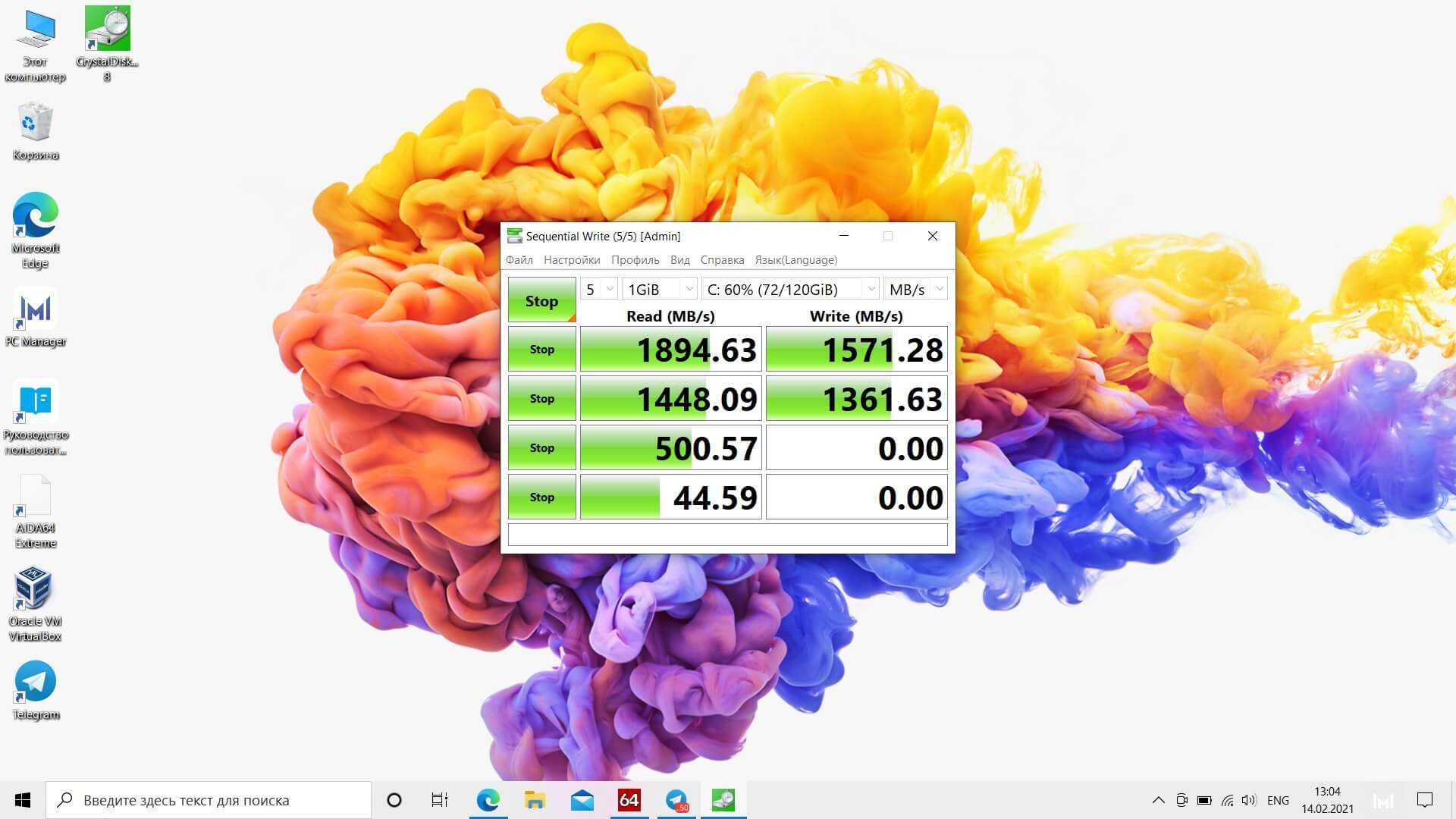 Скорость записи диска утилитой CrystalDisMark была оценена в 1894 МБ/с на чтение и 1571 МБ/с на запись. Это очень высокий результат, которого хватит на три или четыре года использования ультрабука без потребности купить что-то помощнее.