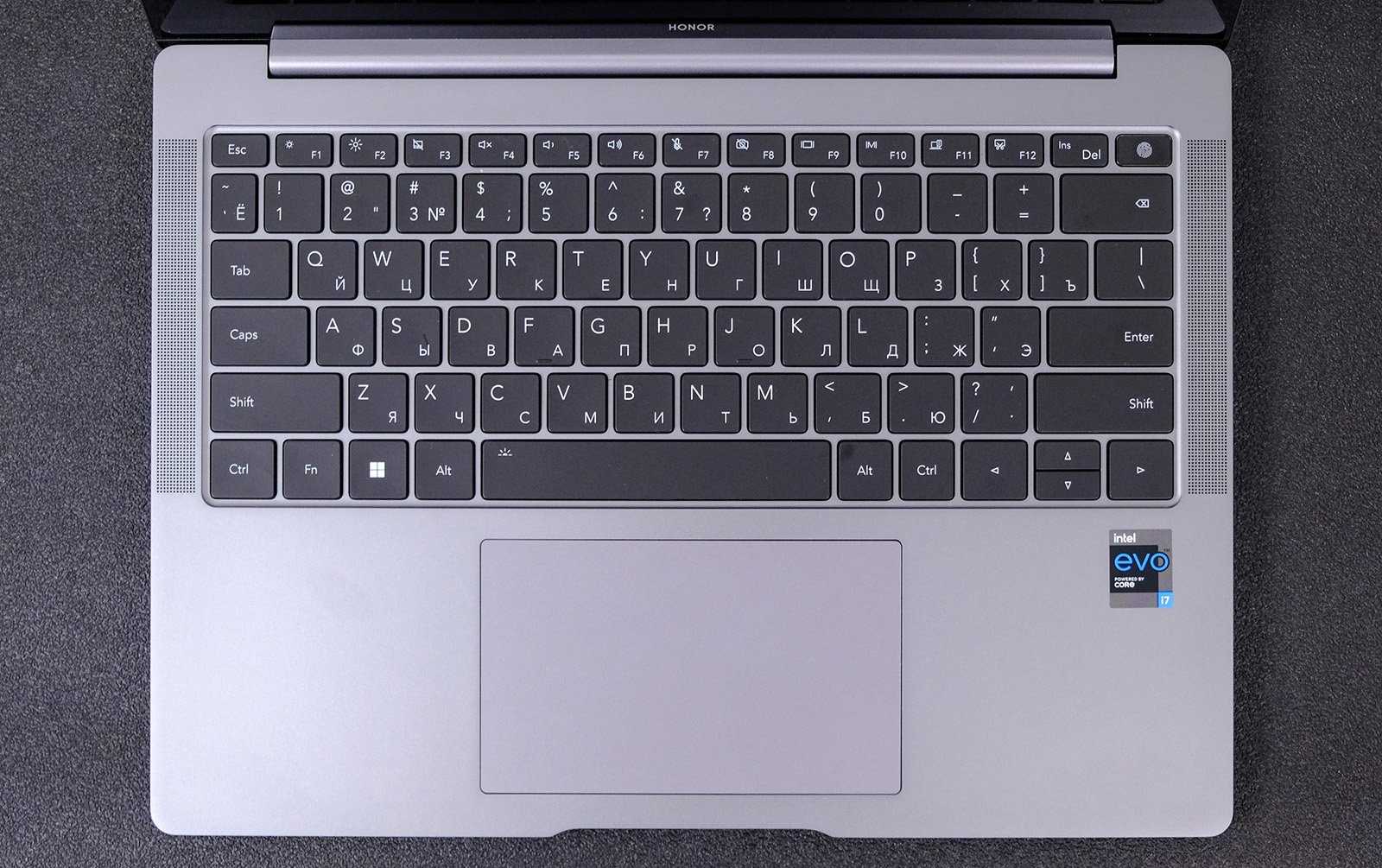 Клавиатура лишена цифрового блока, но для многих это несущественно. Куда важнее то, что клавиши большие и достаточно разнесены. Печатать текст удобно, привыкать почти не приходится. Из особенностей тут отсутствие клавиш PageUp и PageDown, уменьшенные стрелки вверх и вниз и датчик отпечатка в кнопке питания. Удобство последнего сложно переоценить: вместо постоянного ввода пароля достаточно просто коснуться кнопки. Почти всегда датчик отрабатывает быстро и точно. Клавиатура имеет двухступенчатую белую подсветку.