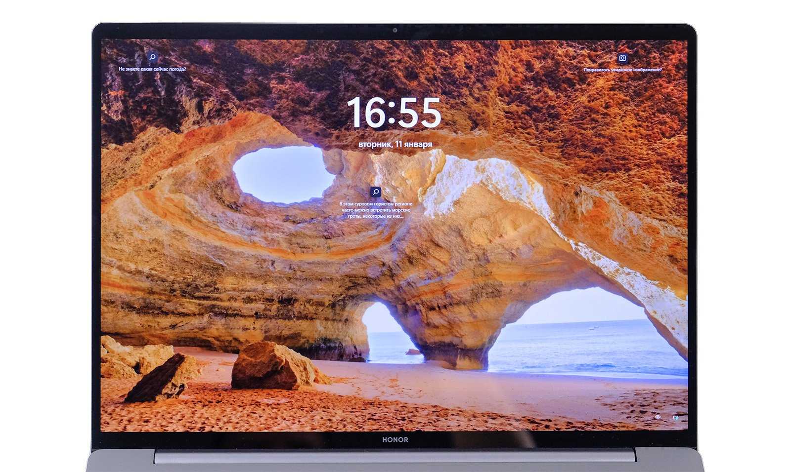 MagicBook View 14 HGE-W76 получил дисплей с IPS-матрицей и нестандартным разрешением 2520×1680 пикселей. Экран сенсорный (до 10 прикосновений одновременно), так что покрытие представляет собой тонкое стекло с олеофобным покрытием, которое имеет зеркальную поверхность и подвержено бликам от ярких источников света. По бокам рамки дисплея всего по 5 мм, сверху и снизу – около 8 мм, причём в верхней части уместилась встроенная веб-камера – модель может похвастать двойной широкоугольной камерой Ultra HD разрешением 5 Мп. ИК-камера при этом также присутствует, что делает возможным разблокировку по лицу даже в темноте.