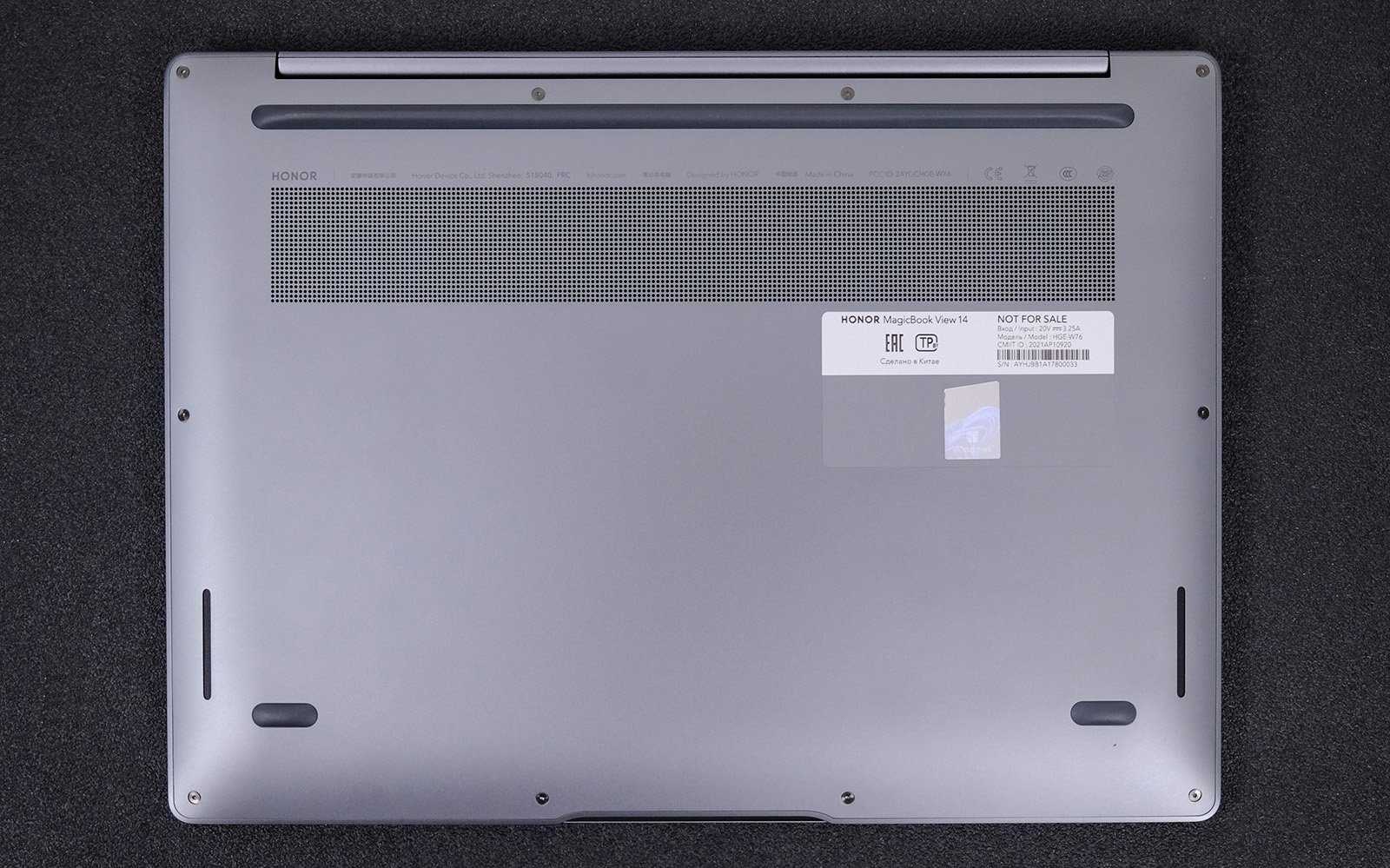По краям днища имеются полоски прорезиненных ножек. На столе девайс стоит ровно и устойчиво. На днище компьютера также имеется наклейка с серийным номером копии Windows. При этом сама ОС активируется автоматически, стоит вам зайти под своей учётной записью Microsoft.