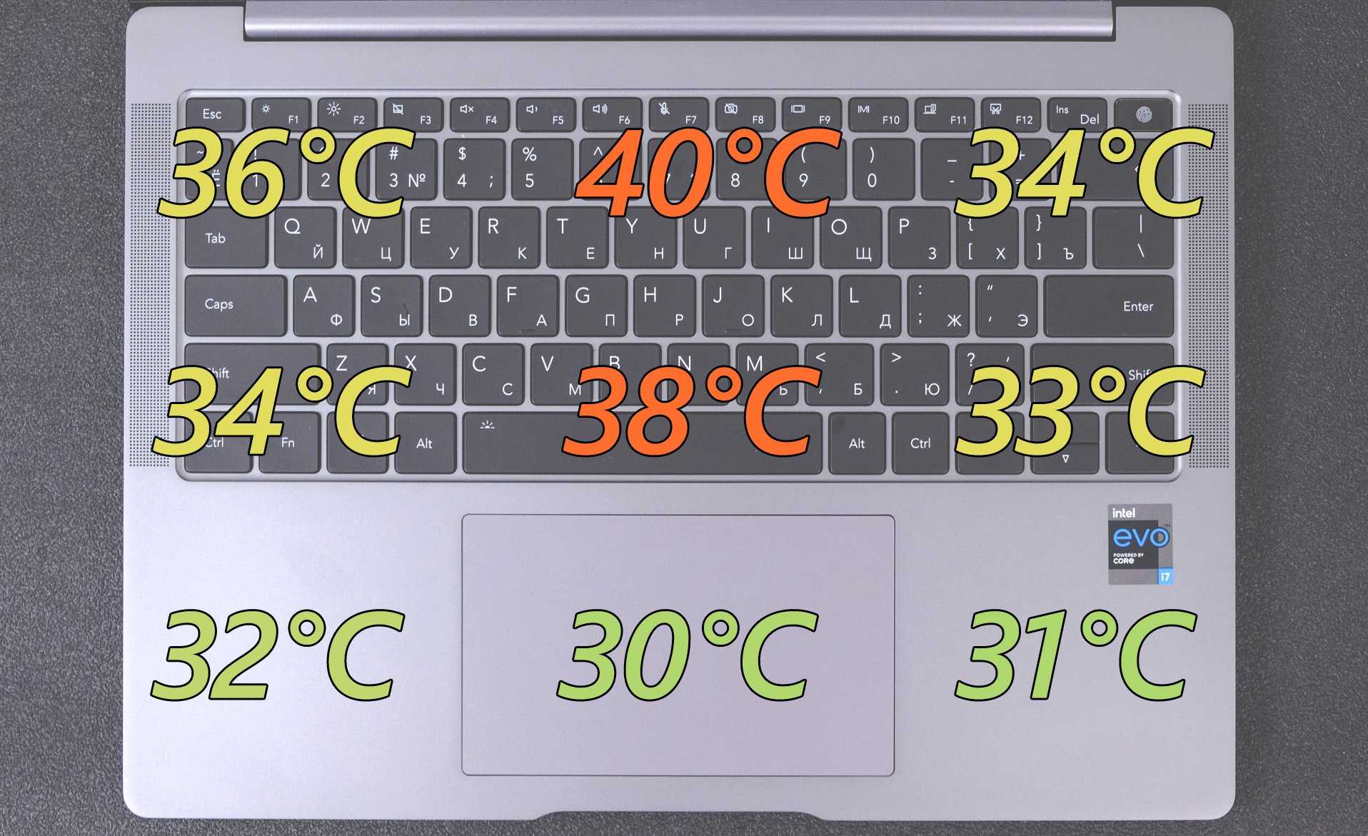 Нагрев корпуса ультрабука даже при длительной сильной нагрузке невысокий – только дальняя центральная часть топкейса прогревается до 40° С, в остальных областях в среднем наблюдается около 33° С.