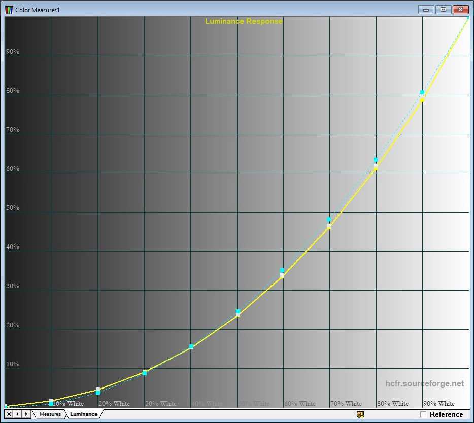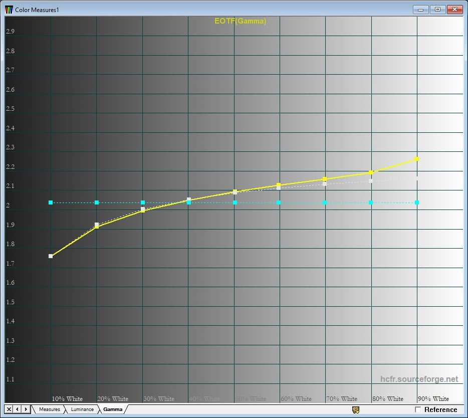 Кривая яркости дисплея полностью соответствует эталонной кривой. Гамма имеет среднее значение около 2,1, меняясь от 1,75 до 2,25.