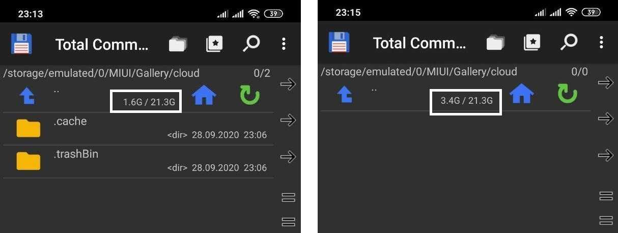 Для этого нам потребуется любой файловый менеджер. Можно воспользоваться стандартным приложением вашего устройства или же скачать проверенный Total Commander. Сначала удаляем папки . trashbin (тут на протяжении 30 дней хранятся фото, которые мы удалили из Галереи) и . cache (хранит часто используемые данные приложений) . В смартфонах Xiaomi они располагаются по адресу Внутренний общий накопитель > MIUI > Gallery > Cloud. Ищем их и просто удаляем.