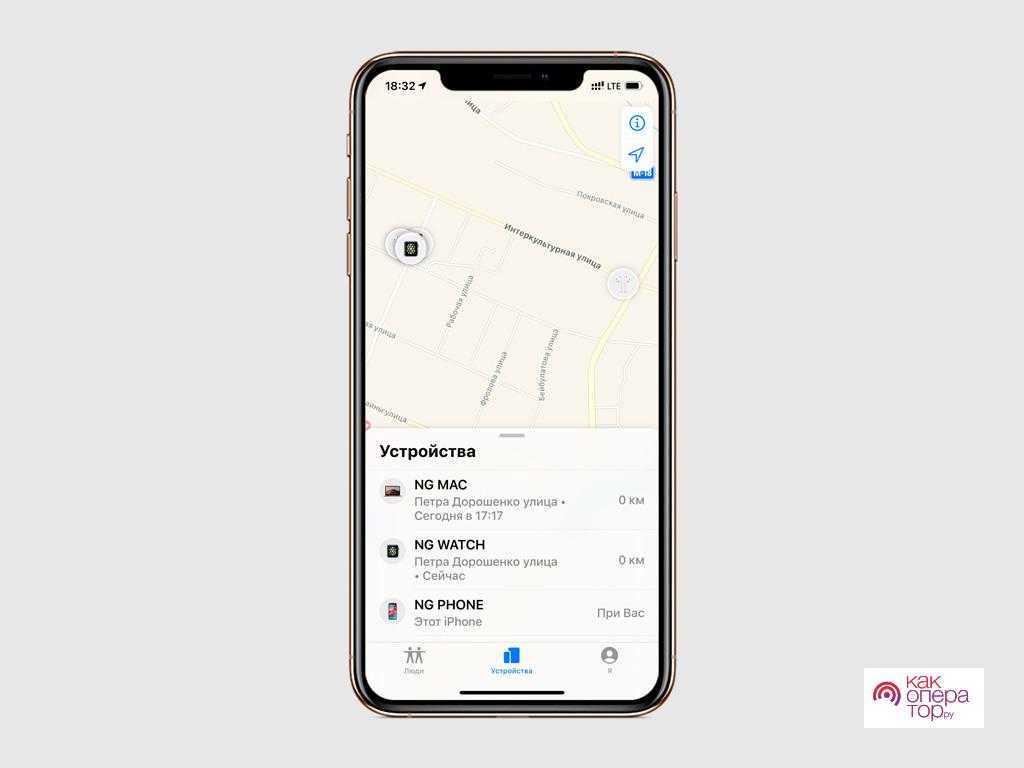 Приложение «Локатор» разделено на три вкладки. Первая помогает искать друзей и членов семьи, вторая — iPhone, iPad, Mac, Apple Watch и AirPods, а третья — управлять личным настройками геопозиции. Для удобства пользователя в каждой вкладке также отображается карта.