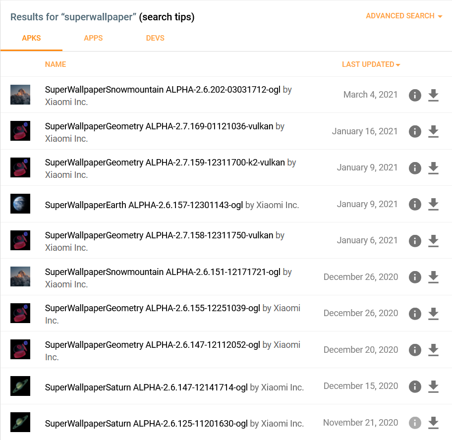 Теперь в строке поиска наберите «superwallpaper», вам мгновенно отобразятся все файлы со всеми темами, которые выпустила Xiaomi. Найдите среди них тот, который называется «SuperWallpaperSnowmountain ALPHA-2.6.202-03031712-ogl by Xiaomi Inc.». Если вы ищите их много позже, чем написана данная статья, учтите, что версия приложения может быть иной, это даже лучше.