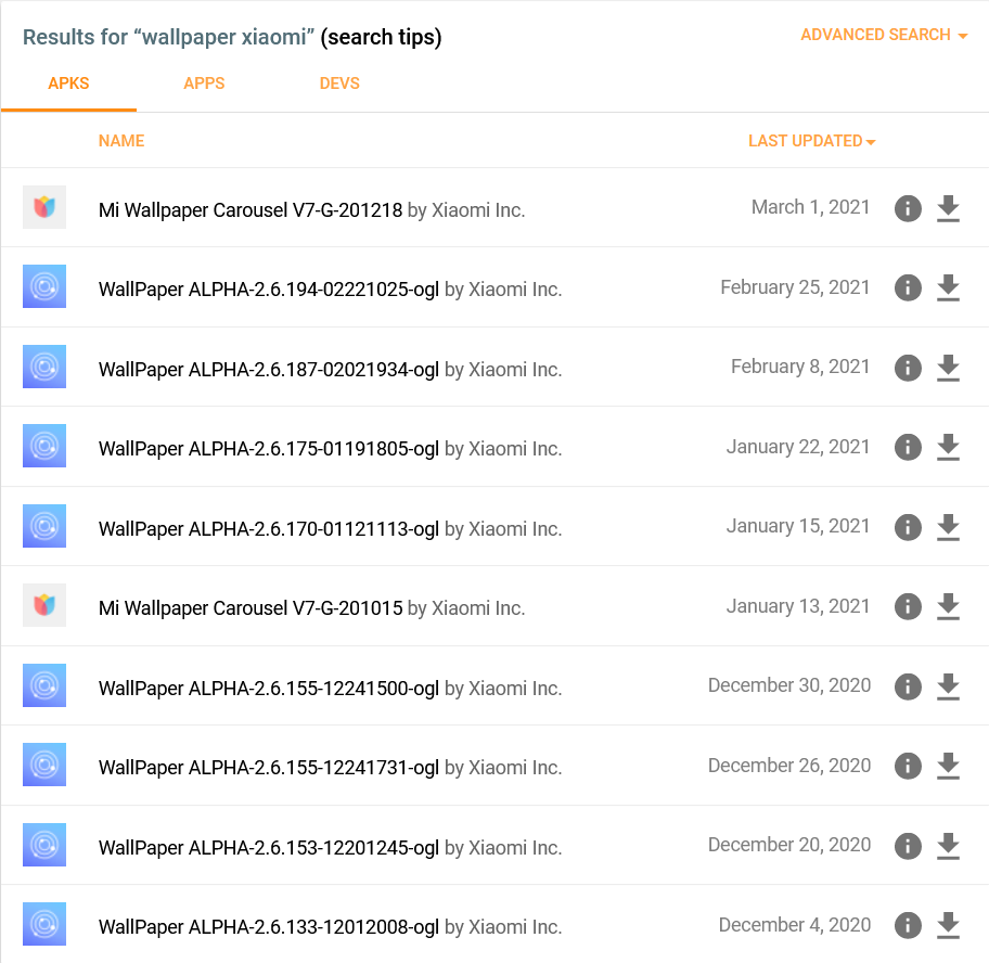 В строке поиска наберите фразу «Wallpaper xiaomi», вы увидите поисковую выдачу, в которой будут множество файлов с разной датой и версией. На момент написания статьи самая свежая версия приложения «WallPaper ALPHA-2.6.194-02221025-ogl by Xiaomi Inc.», выбирайте её или, если есть более свежая, её.
