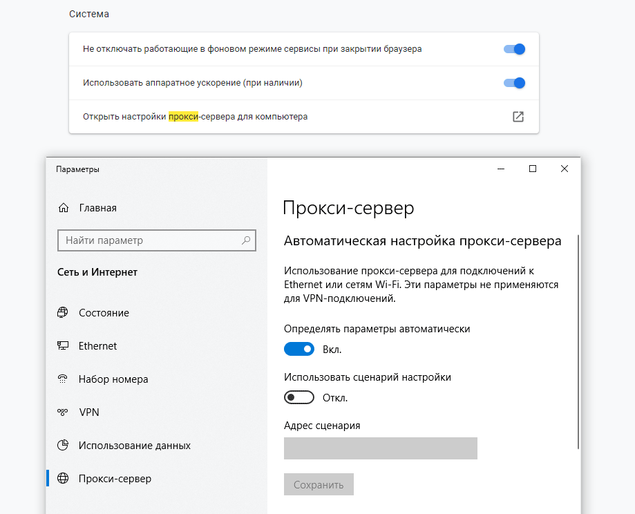 Например, в Chrome соответствующая опция называется “Открыть настройки прокси-сервера для компьютера”. При нажатии на ссылку откроются настройки ОС Windows, где можно проверить настройки прокси.