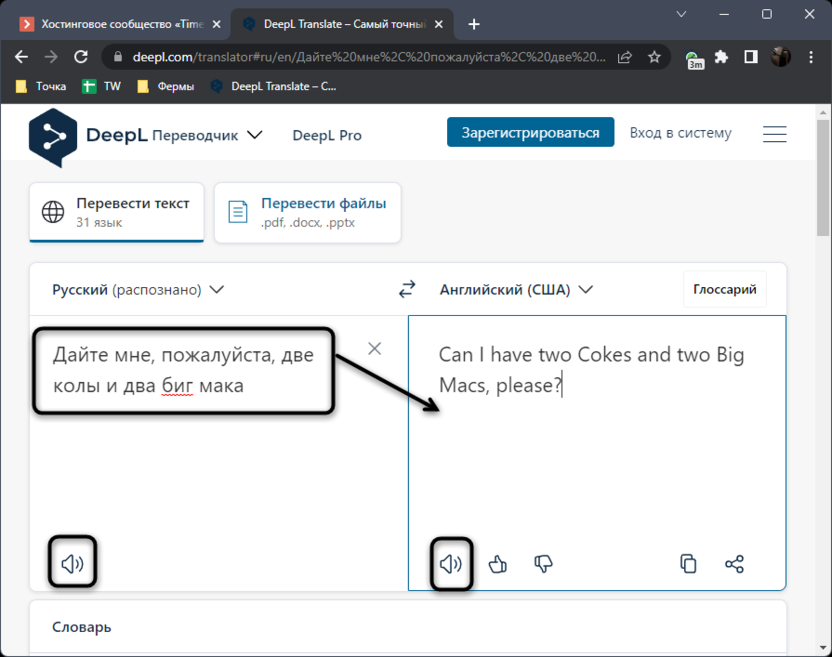 Стандартный перевод выглядит обычно. Слева отображается введенная фраза, а справа – ее вариант на выбранном языке. Ниже есть кнопки с динамиками, при помощи которых можно преобразовать текст в голос, чтобы послушать произношение слов.