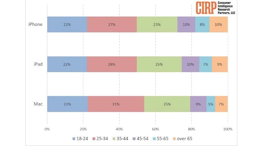 Последние данные показывают, что 25% пользователей iPhone составляют лица в возрасте от 34 до 27 лет. Вторая по популярности возрастная группа — от 35 до 44 лет (23%), за ней следуют от 18 до 24 лет (22%).