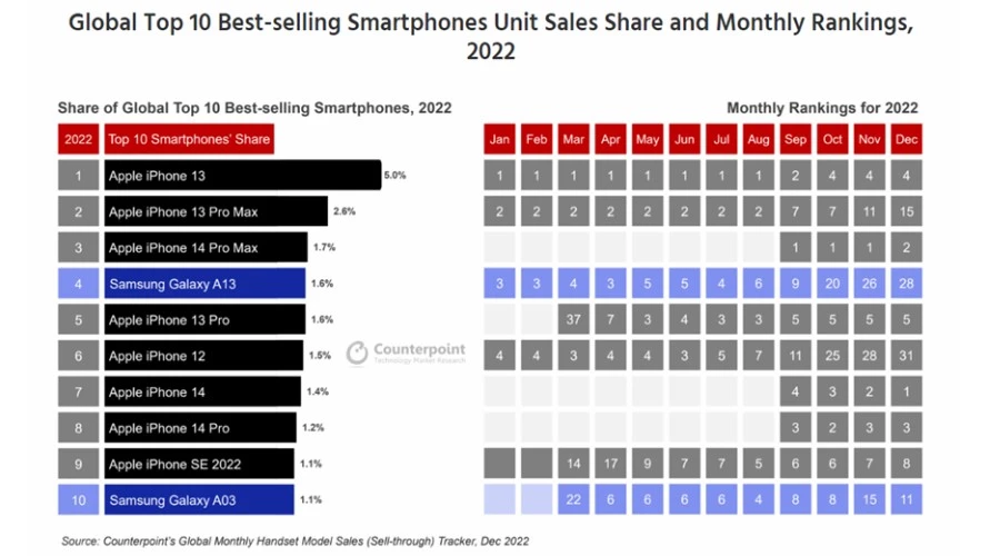 Из-за возобновления государственных ограничений на COVID в Китае Apple пришлось отложить поставки своей линейки iPhone 14 в последнем квартале 2022 года. В этот период ей все же удалось занять более высокую долю рынка, чем Samsung.