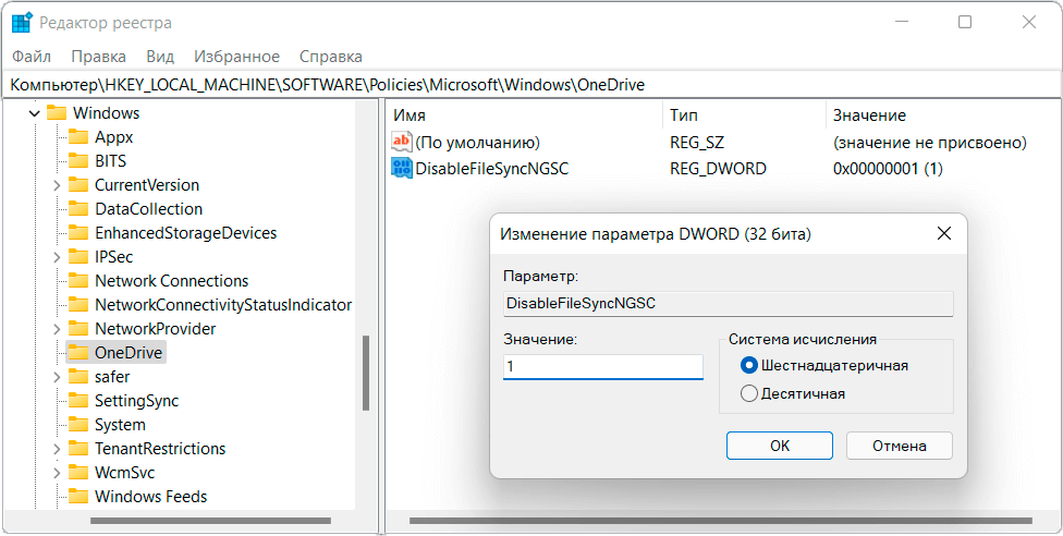 Собственно, или выполните команду regedit в окошке Win+R. Перейдите в раздел HKEY_LOCAL_MACHINE\ SOFTWARE\ Policies\ Microsoft\ Windows\ OneDrive. Значение параметра DisableFileSyncNGSC установите 1. Мне пришлось создать раздел и параметр DWORD (32-бита).