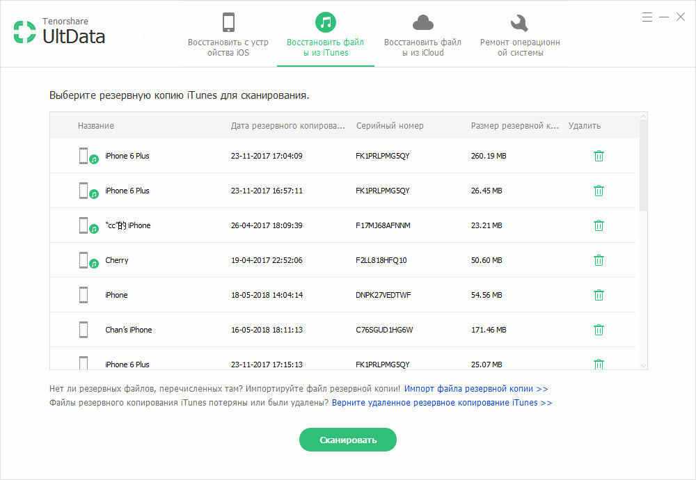 1. Переходите к «Восстановить из резервной копии iTunes». iPhone Data Recovery автоматически отображает все резервные файлы в iTunes.