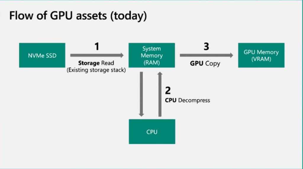 В настоящее время, когда игра запрашивает данные (такие как текстуры, аудио или модели) из системного хранилища, API -интерфейс хранилища извлекает данные и перемещает их в системную оперативную память(Random Access Memory) ( RAM ). Отсюда он передается в VRAM графического процессора (GPU)(Graphical Processing Unit’s (GPUs)) для рендеринга для отображения.