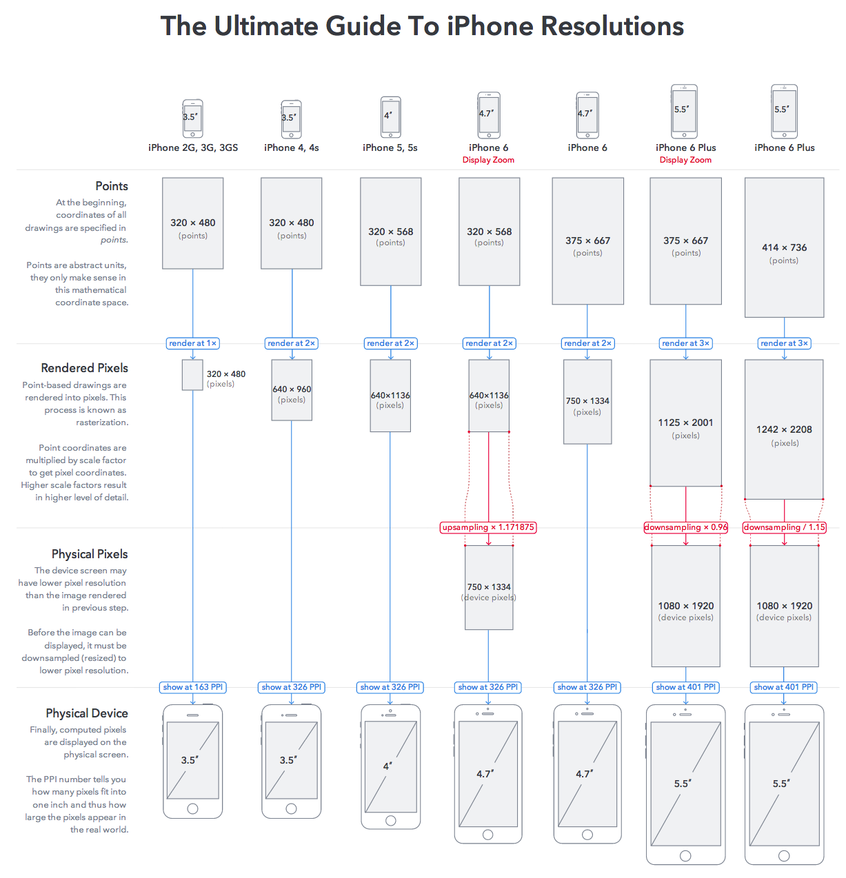 | iPhone 6+ | 2014 | 375 × 667 | 750 × 1334 | 9:16 | 4.7″ | 326 |