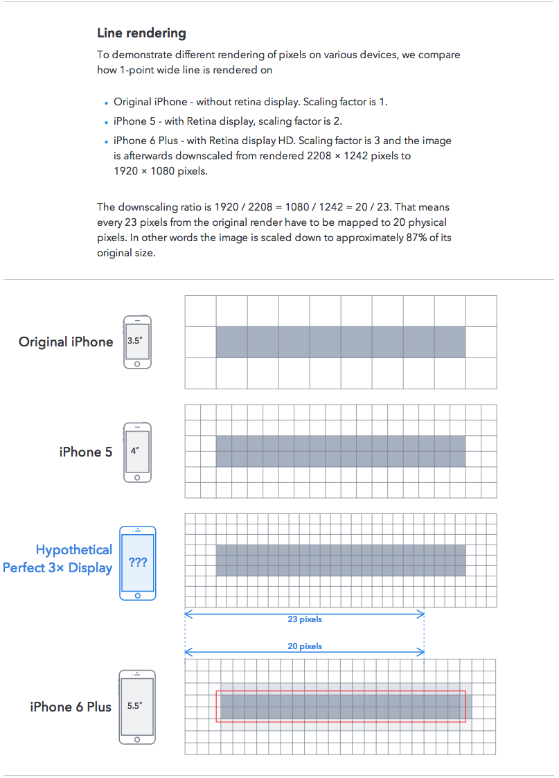 Когда iPhone6 + действительно отображается, даунсэмплинг / 1.15 (1242×2208->1080×1920), Чтобы быть точным, оно должно быть @ 2.46x. Apple использует материал @ 3x для удобства разработчиков, а затем увеличивает до @ 2.46x.