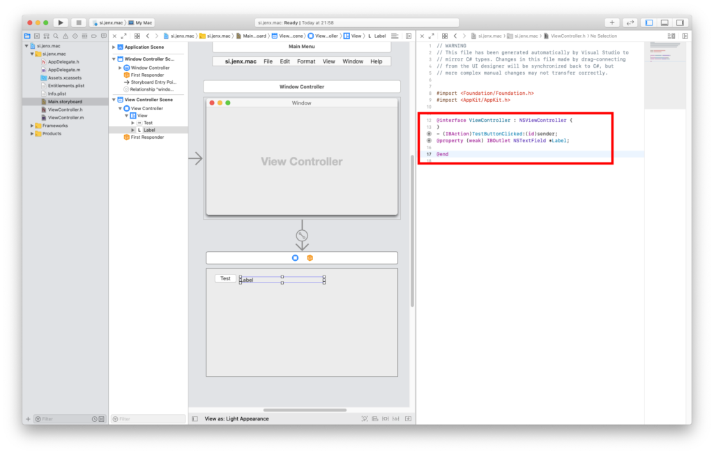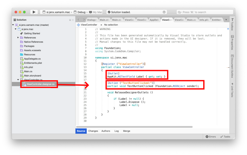 When I save everything, close Xcode and return to Visual Studio for Mac, I can see that VS for Mac generated some code. Generated code is link between C# code and GUI elements.