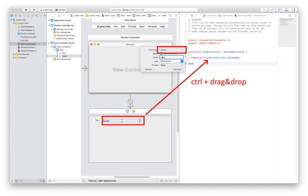 Now, it’s time to wire-up controls with C# code. First, I open my in Xcode (check previous section how to to this). Then I rearrange windows as shown on bottom picture. Because, I’ll do some drag-and-drooping it’s very convenient to properly arrange windows to be visible on my desktop. Window on the right-hand-side shows Visual Studio generated ViewController header (.h) file. Middle sections depicts Main.storyboard GUI designer.