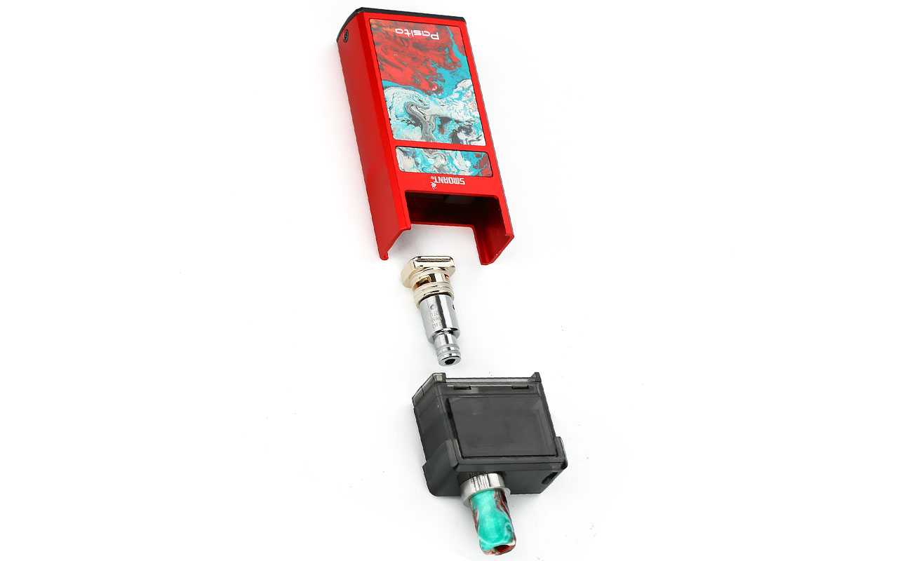 Компания Смок проработала дизайн и функционал. Лицевая сторона пода в актуальной расцветке, а на обратной предупреждения и значки сертификатов. Компактный размер стилизован под глянцевый пластик. Картридж располагается сверху, а для забора воздуха два отверстия есть ниже. Устройство выполнено в разных расцветках.