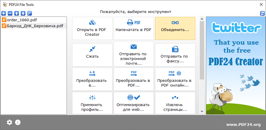 У пользователей есть возможность мгновенно «склеить» несколько загруженных объектов в один. Следует придерживаться несложной инструкции для PDF24 Creator как объединить файлы: