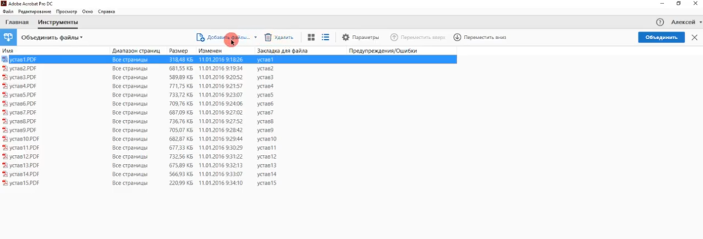 - Выберите файлы PDF или другие документы, которые нужно объединить при помощи инструмента слияния файлов PDF.