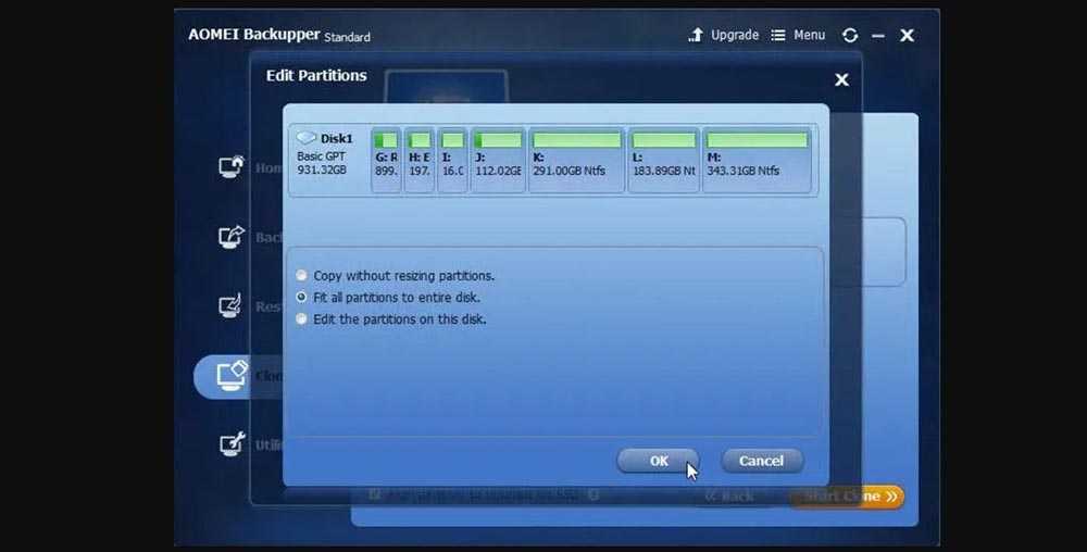 - Чтобы изменить размер разделов для использования полной емкости, выбрать «Редактировать разделы в месте назначения». Это следует сделать при клонировании небольшого HDD.