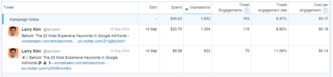 Emojis are incredibly fun, and they can also help increase the reach of your social media posts and boost engagement.For example, internet marketer Larry Kim ran a quick experiment where he split-tested the same promoted post with and without emojis to the same targeting group at the same time. The results of this experiment were pretty impressive. The emoji version had 25.4% higher engagement and a 22.2% lower cost per engagement ($0.18 vs. $0.14).