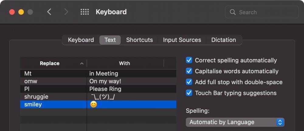- Используйте функцию быстрой замены. В настройках системы MacBook вы можете настроить автоматическую замену определенных слов или комбинаций символов на соответствующие смайлики. Например, вы можете настроить, чтобы слово «:)» автоматически заменялось смайликом «». Проверьте настройки подсистемы «Текст» в разделе «Клавиатура» системных настроек.