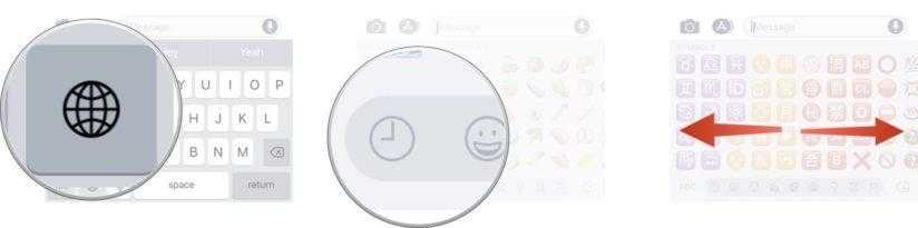 - Нажать на иконку глобуса и среди появившегося блока эмодзи выбрать нужный смайлик.