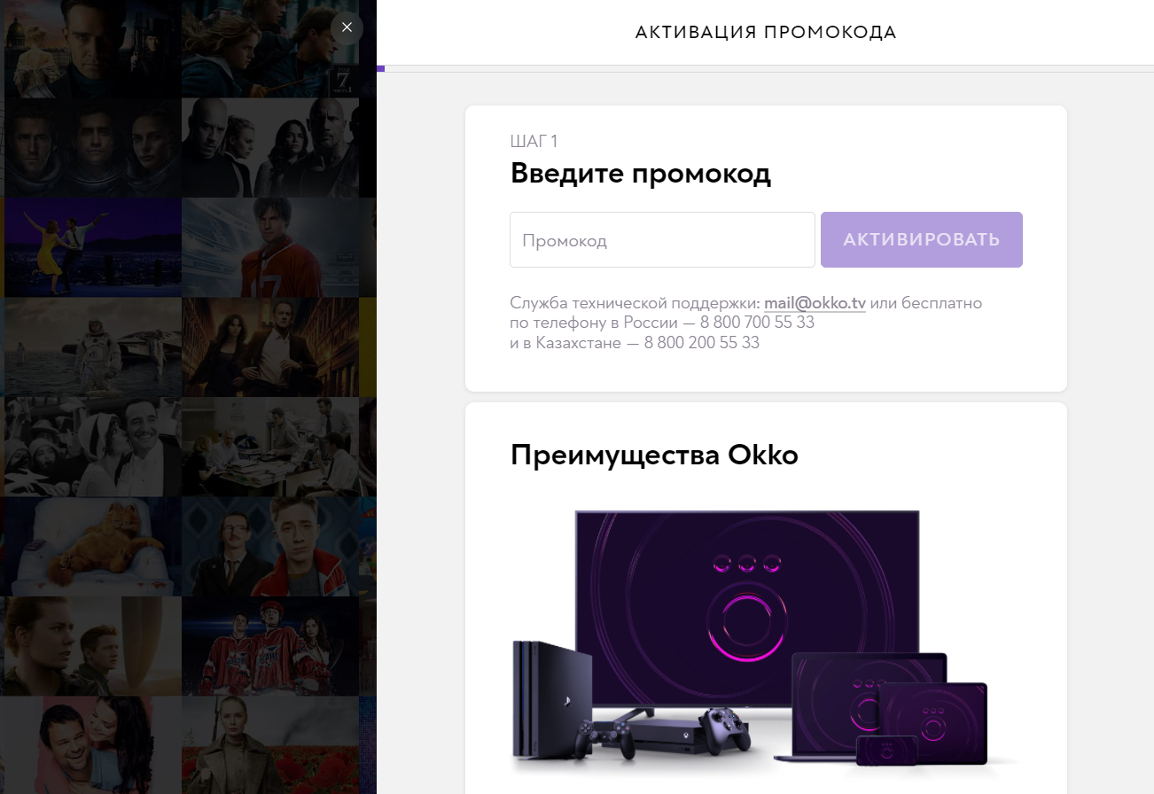 Если вы стали счастливым обладателем подарочного промокода на подписку кинотеатра OKKO, то для ее активации нужно выполнить следующий алгоритм действий: