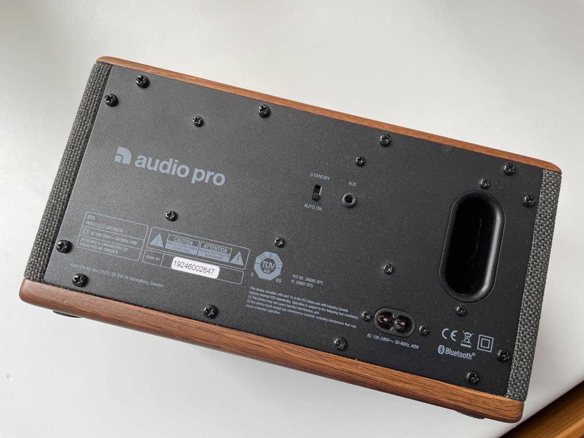 Внешне Audio Pro BT5 просто влюбила в себя, а что у нее со звуком? Колонка оснащена усилителем класса D, который выдает мощность 40 Вт на мягкий купольный 19-миллиметровый твитер и 4-дюймовый вуфер. Диапазон частот динамика — от 50 Гц до 20 000 Гц. Сзади имеется отверстие фазоинвертора для расширения нижнего диапазона.