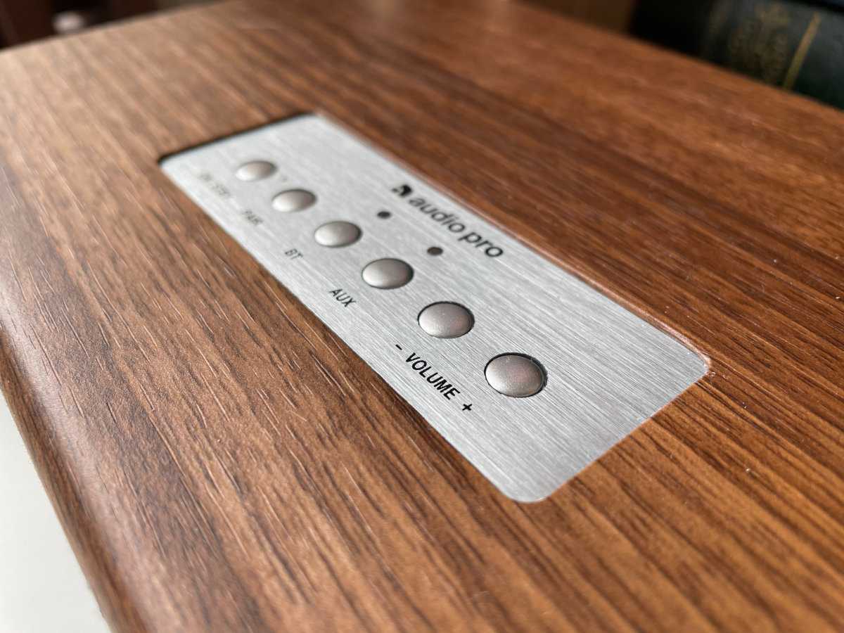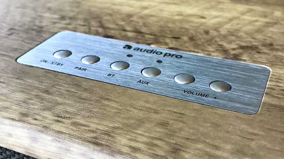 На верхней панели Audio Pro BT5 рядком расположены 6 кнопок: включения/выключения колонки, активация сопряжения по Bluetooth, две кнопки для выбора между кабелем и беспроводным соединением, которые подсвечиваются при активации и еще парочка для регулировки громкости. Кнопки довольно маленькие и легко путаются, если нажимать наощупь.