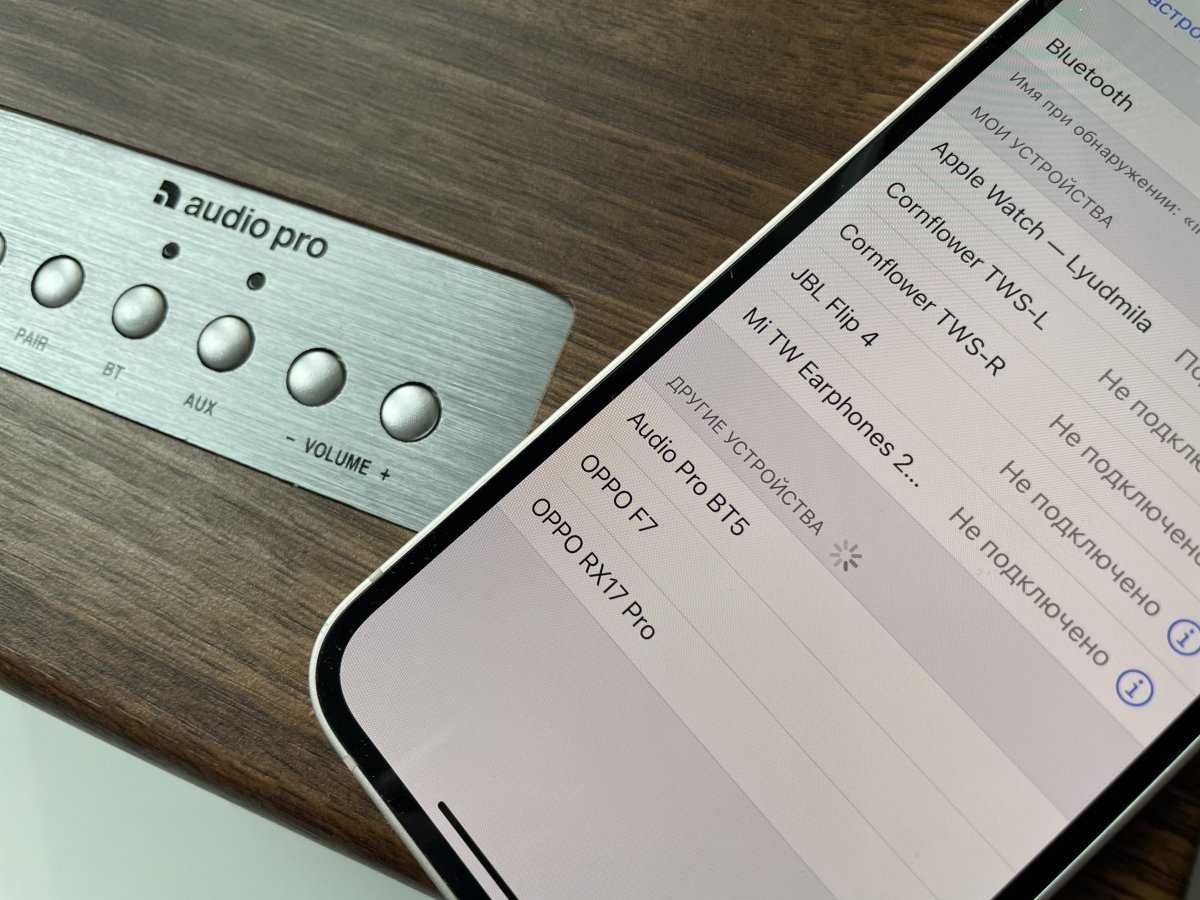 После нажатия на кнопку Pair колонка Audio Pro BT5 быстро подключается к обнаруженному рядом аппарату, причем проблем не возникло ни с Android-смартфоном, ни с iPhone.