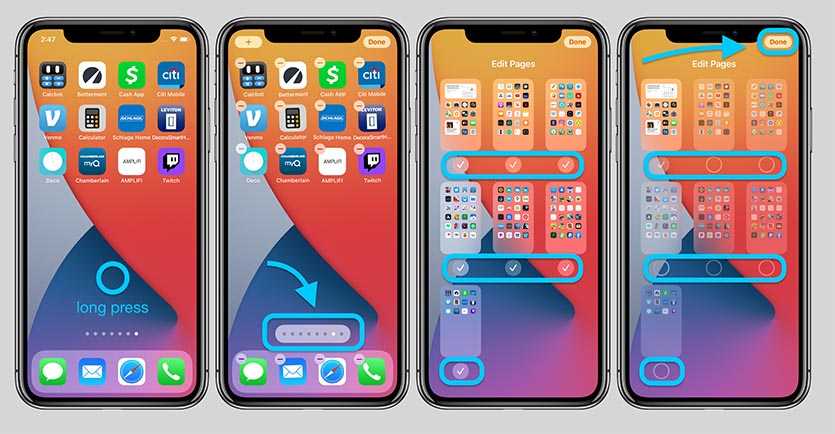 Для скрытия целого рабочего стола перейдите в режим редактирования иконок и нажмите на индикатор рабочих столов. Появится меню, в котором можно скрыть ненужные рабочие пространства с иконками. Можно оставить всего один рабочий стол.