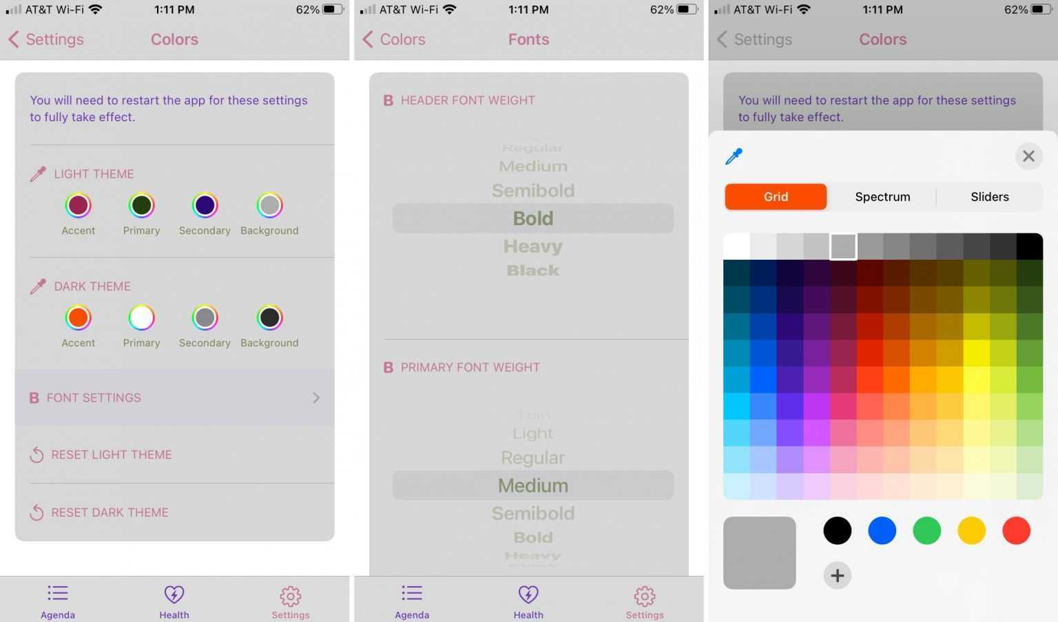 Вы можете выбрать тёмную или светлую тему в настройках приложения. В нём можно выбирать стили, цвета разных элементов и цвет фона. К тому же, выбор доступен не просто из самых популярных цветов, вы можете выбрать абсолютно любой цвет с помощью спектра и слайдеров. Затем можно настроить оттенок и насыщенность цвета.