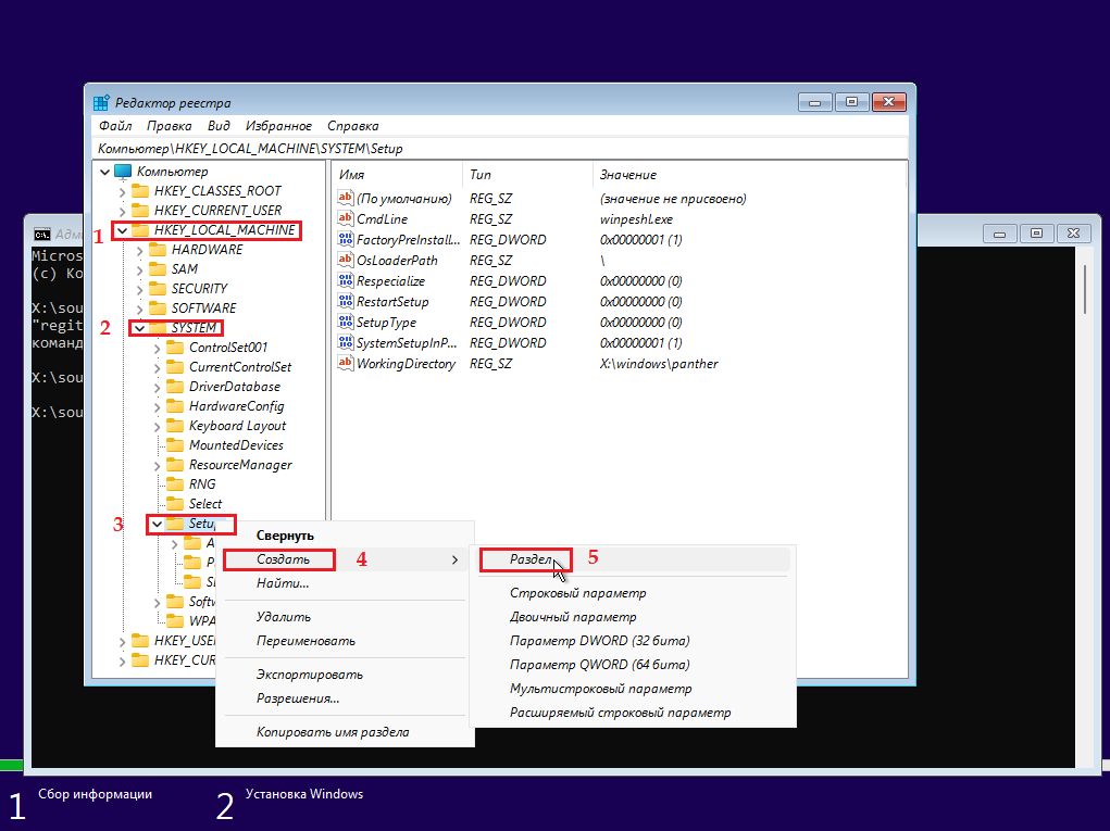 Откройте командную строку сочетанием клавиш «Shift» + «F10». После введите команду «regedit» и кликните «Enter» на клавиатуре, чтобы ее выполнить.