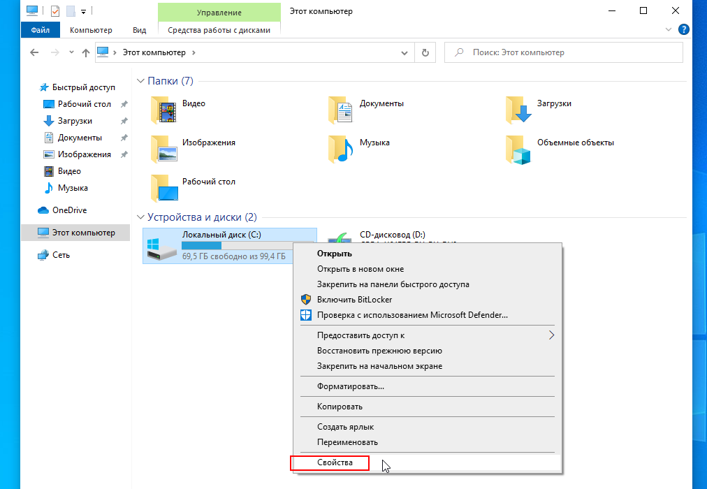 Нажать правой кнопкой мыши по Локальному диску C.