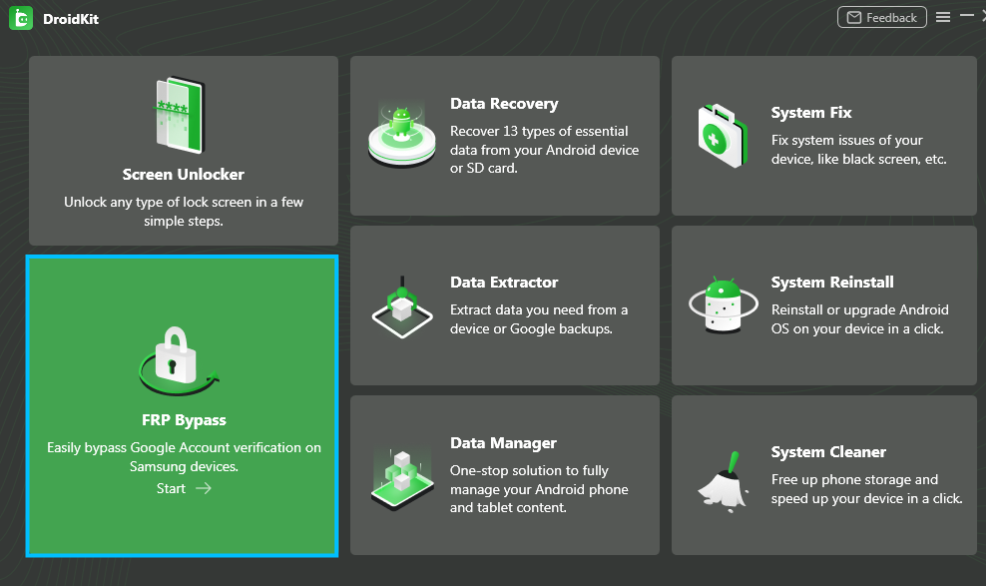 Скачайте и установите DroidKit на вашем ПК и выберите вкладку «Обход FRP» в интерфейсе. Тем временем подключите устройство к компьютеру с помощью USB-кабеля.