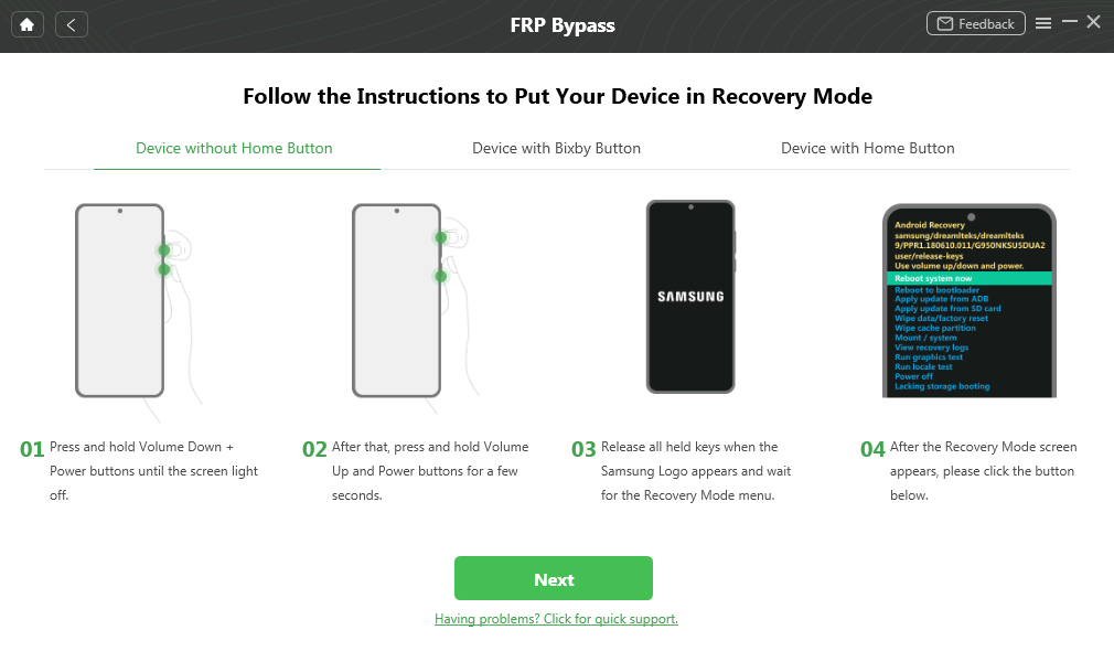 Ниже мы собрали шаги, чтобы продемонстрировать, как использовать функцию обхода FRP DroidKit для разблокировки телефона, заблокированного Google, без учетной записи Google и пароля.