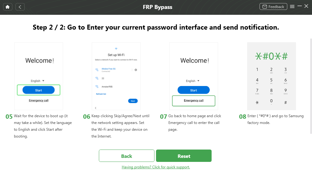 Следуйте инструкциям на экране, чтобы войти в интерфейс пароля и отправить уведомление. Нажмите «Сброс», чтобы начать процесс обхода FRP.